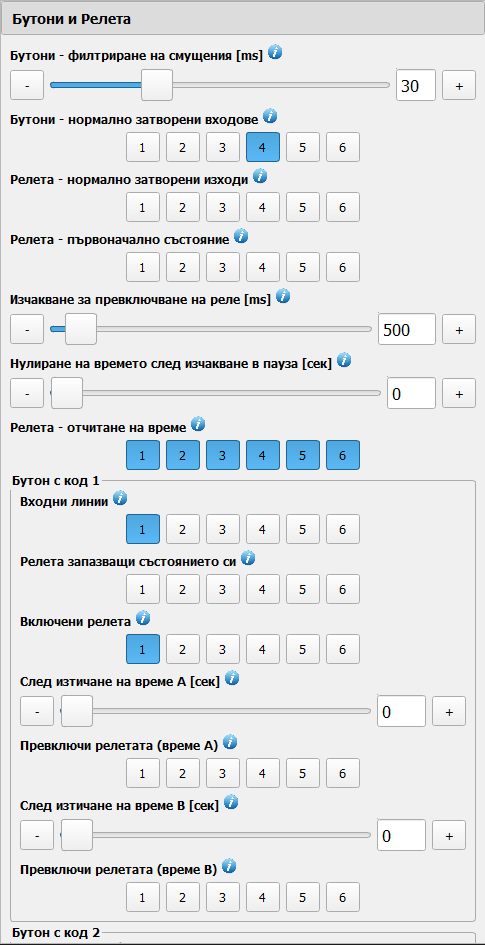 Настройването на сигналите от бутоните към съответната програма става от групата „Бутони и Релета“, като за всяка група се зададе съответната комбинация от „Входни линии“.