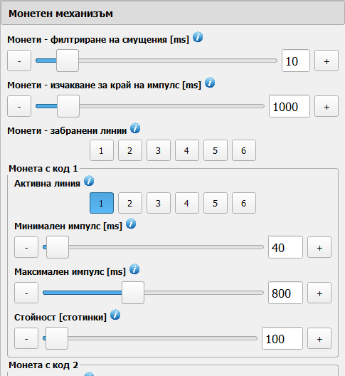 За настройките е допустимо няколко кода за монети да имат една и съща активна линия, но различна минимална и максимална продължителност на импулса, които не се припокриват. Например: код 1 - 60-140 мс., код 2 - 160-240 мс., код 3 - 260-340 мс.