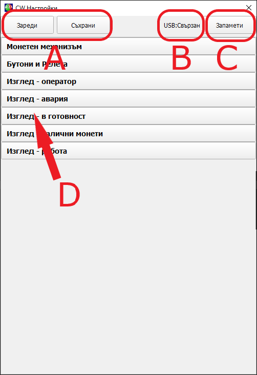 Зареждане и запис на текущите настройки на компютъра/телефона/таблета. Служи като архив и готов шаблон за нови контролери.